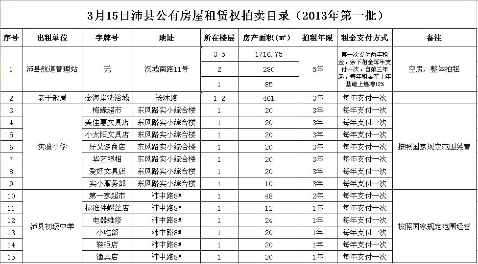 我公司受委托,定于2013年3月15日10:30時(shí)在徐州中山南路55號(hào)拍賣沛縣以下公有房屋租賃權(quán):